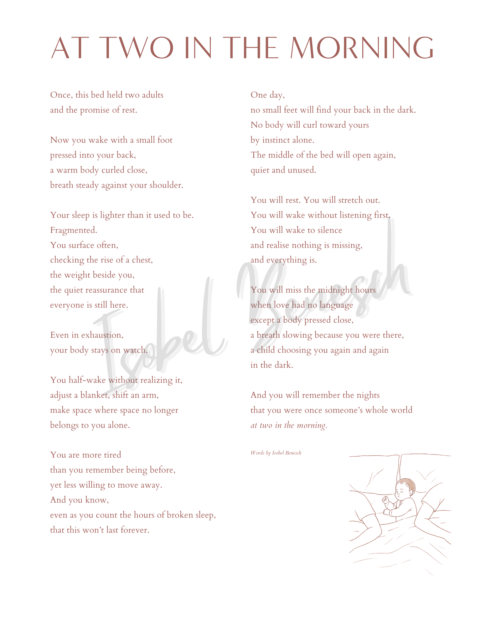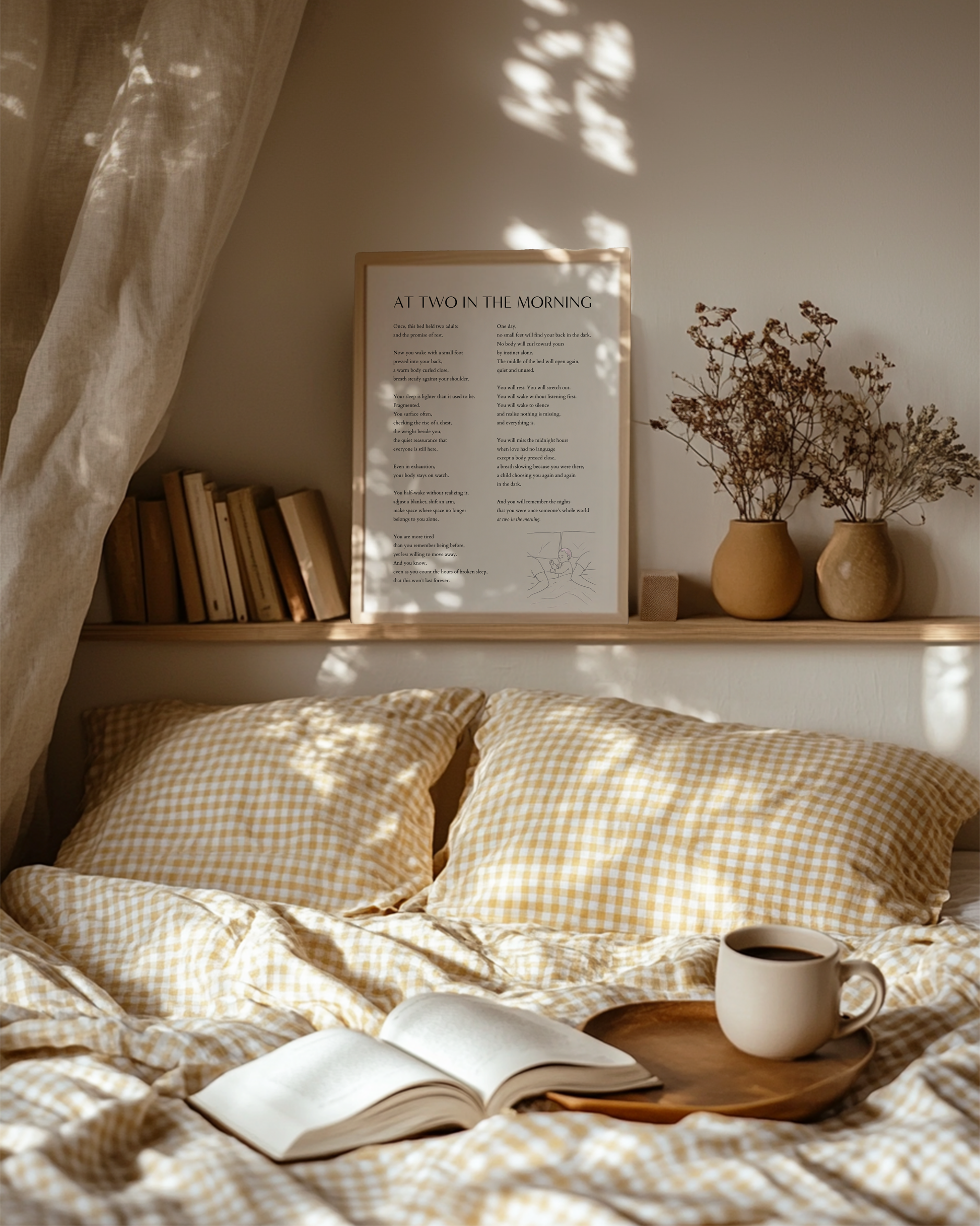 At Two in the Morning is a love letter to the kind of closeness that costs you rest but gives you something deeper in return. A reminder that one day the bed will be wide again. The room will be quiet. No one will reach for you in the dark.
