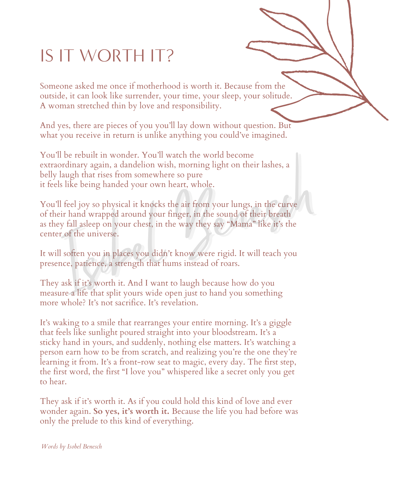 Is It Worth It? is a celebration of the kind of love that doesn’t just fill your heart — it expands it beyond recognition. It’s for the mother who has discovered joy so fierce it lives in the everyday, in small hands, shared laughter, and the soft weight of a child against her chest.